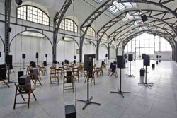 For this installation, the two artists again employ technical processes they developed for earlier works such as »The Forty Part Motet« (2001), »The Berlin Files« (2003) and »Pandemonium« (2005), now expanding those field-tested control systems through the use of newly created software. Their spatial dramatization of the acoustic material goes far beyond the scope of the classic radio play, as they carry the listener off into a fascinating, uncanny world full of suggestive sounds and dream images.