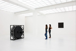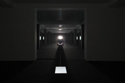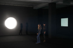 The eponymous work »db« (2012) is centrally placed in both halls. In one room, it consists of a black super-directional loudspeaker that projects a pure wave of sound into the white space; in the other room, a powerful searchlight projects a beam of white light into the black space. The sound in the white room is reduced to a standing sine wave, the simplest musical building block. Every movement by a visitor alters the sonic field, allowing it to be experienced individually. The beam of light in the black room is directed through a hole in a wall at one end of the space and thus becomes perceptible, unreflected, as a white circle. The beam consists of pure white light that, analogously to white noise, contains all the colors of the spectrum. Here, too, visitors’ movements alter the space; whenever they cross the beam of light, reflections illuminate the dark room.